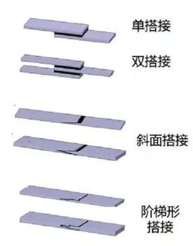 从强度角度考虑:当胶接构件较薄时,宜采用简单的单面搭接或双面搭接形式。当胶接构件较厚时,由于偏心载荷产生的偏心力矩较大,宜采用阶梯型搭接或斜面搭接形式: