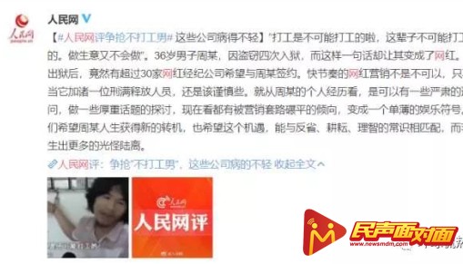 有人指出周某已经接受改造,得饶人处且饶人,当然他选择改过自新重新做人,社会愿意接纳他,成为一个普通人就好。大家请理智思考,把一个四次入狱的小偷捧成网红,给我们的年轻人带来什么价值观?但是,为了炒作无底线的营销还在中国肆意进行着,这场病毒带给国人尤其是年轻人的残害比新冠病毒还要严重。
