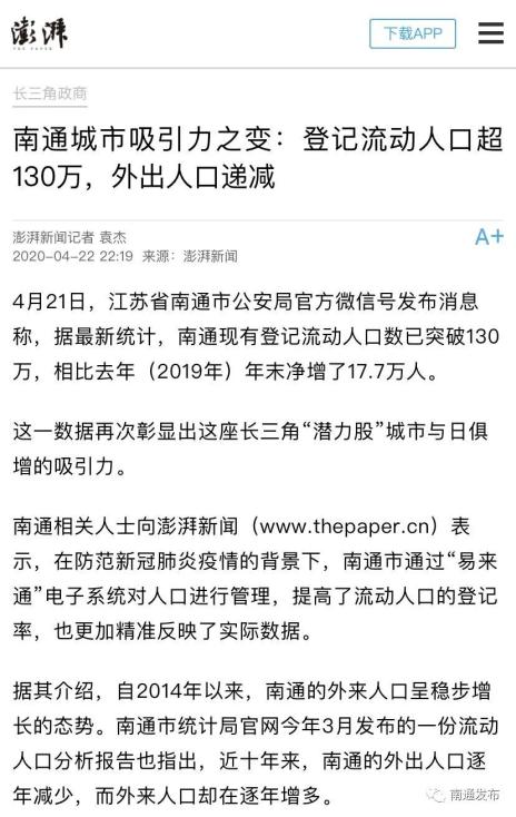 原标题:《澎湃新闻:外来人口逐年增多,折射南通城市吸引力提升》