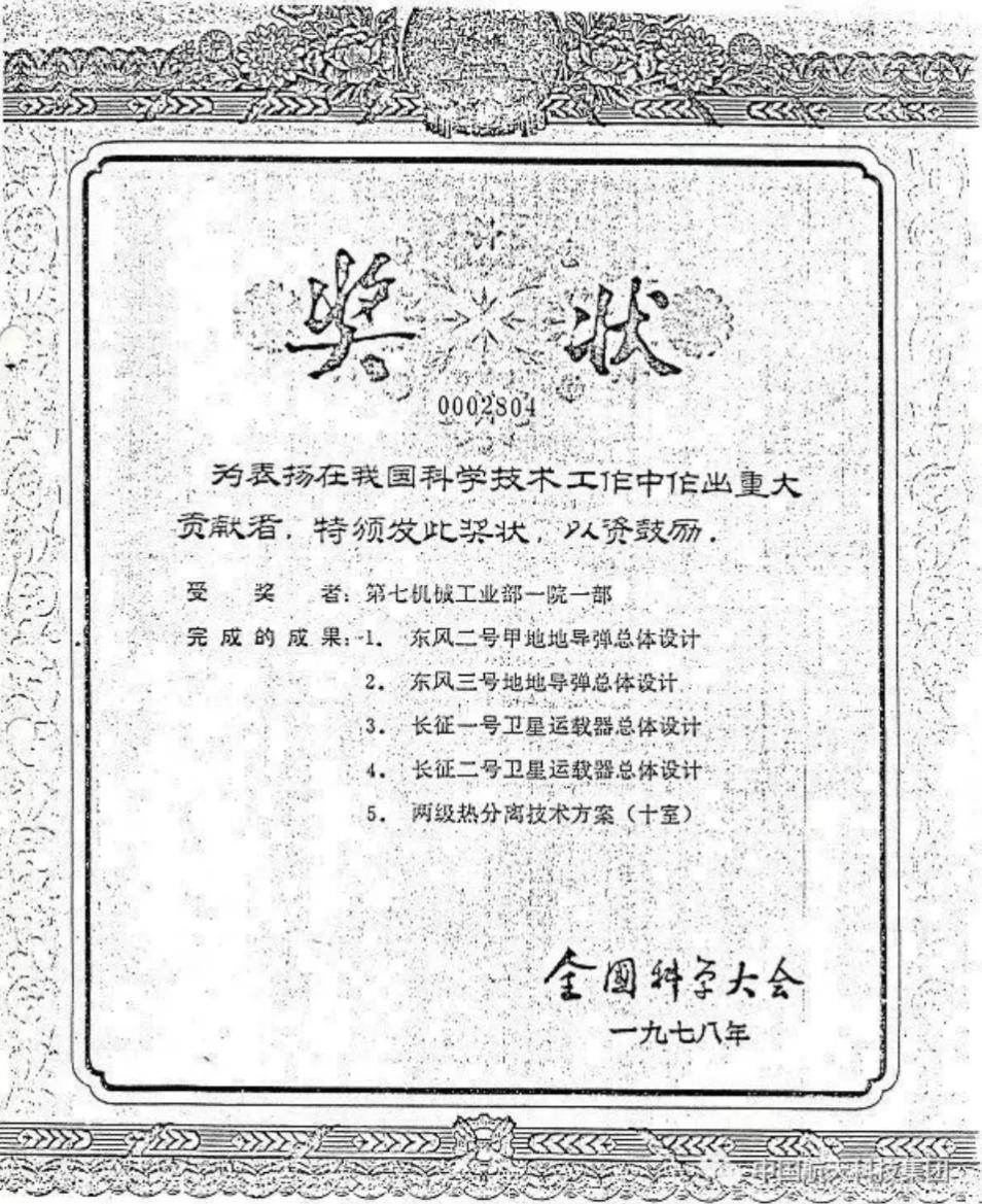 “长征一号”发射的东方红一号卫星,质量超过了苏、美、法、日四国首颗卫星质量的总合,极大缩短了我国运载火箭与国际先进水平的差距。在1978年召开的全国科学大会上,一院“长征一号火箭总体设计方案”和“两级火箭热分离技术方案”2个专项,荣获了“国家科学技术重大贡献奖状”。