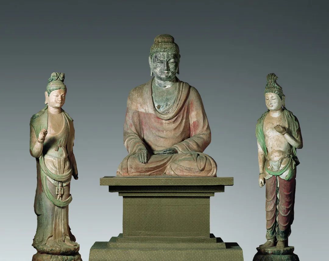 2.主要佛像有释迦、交脚菩萨装的弥勒。其次有佛装弥勒、思惟菩萨和酒泉文殊山前山千佛洞出现的成组的十佛(十方佛)、阿弥陀三尊。以上诸像,除成组的十佛为立像外,皆是坐佛。