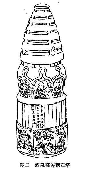酒泉高善穆石塔 承玄元年(428年)建。高44.6、基座底径15.2厘米。八面基座每面雕供养人一身,左上端刻八卦符号。圆形塔身下部刻发愿文与《增一阿含·结禁品》,共三十六行。塔身上部(复钵)雕七龛佛像,一龛菩萨像。佛像皆着通肩服装,作禅定相,后有项光、身光。菩萨着有缯饰的宝冠,袒上身,有颈饰、臂钏,下著裙,交脚坐,后有项光和“靠背”。佛座为矮平莲座。圆拱龛,有龛柱,无龛楣。相轮之上有宝盖,盖顶刻北斗七星(图二)。