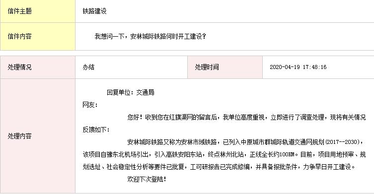 近日,有网友在林州官网红旗渠网领导信箱留言,询问安林城际铁路最新进展,得到官方回复。