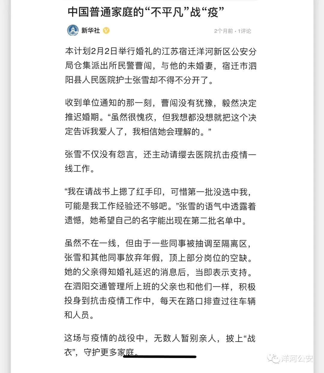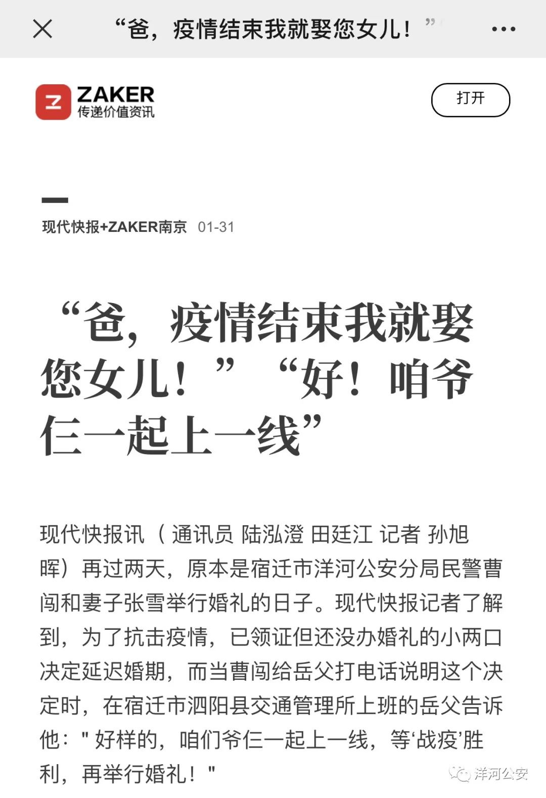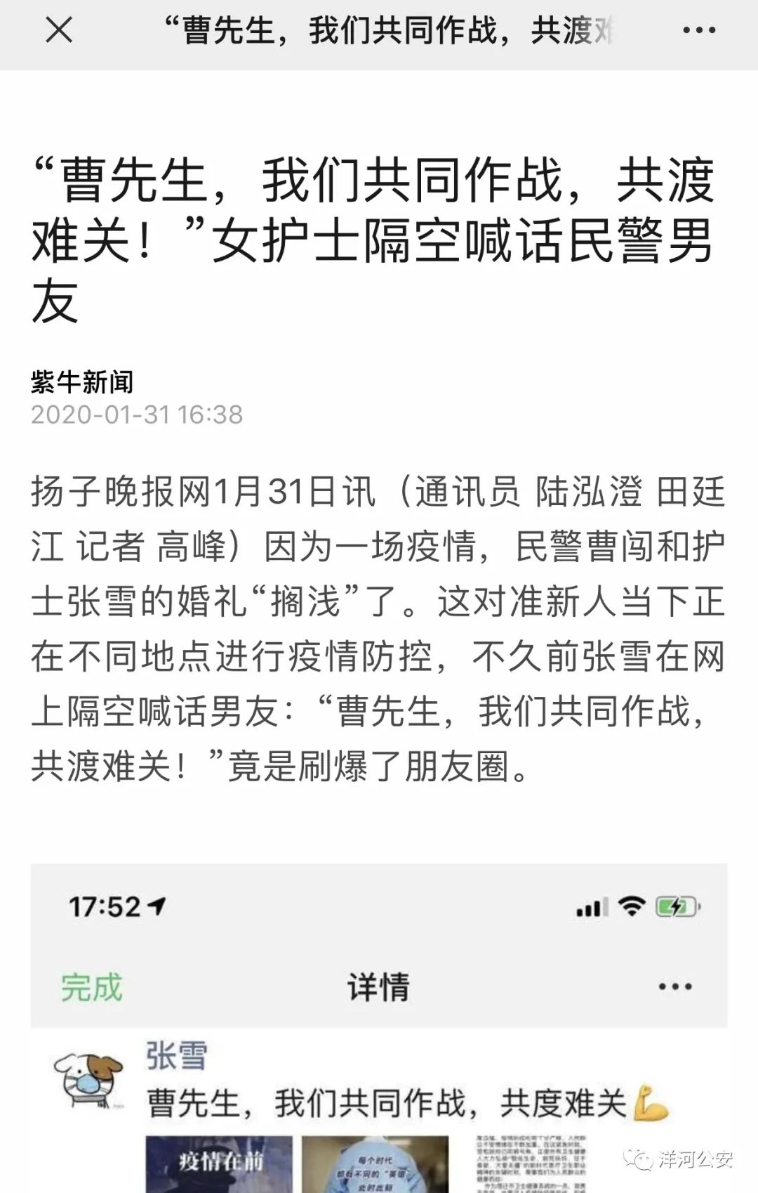 今年24岁的曹闯,2018年从江苏警官学院毕业后,成为洋河新区公安分局仓集派出所的一名民警。张雪是泗阳人民医院的一名护士。两人因缘相识,原定今年2月举行婚礼。一场突发的疫情席卷而来,作为特殊岗位的他们,在被责任选中时,他们选择申请加入抗疫一线,用张雪妈妈的话说,两个孩子好像就在那一瞬间,长大了。