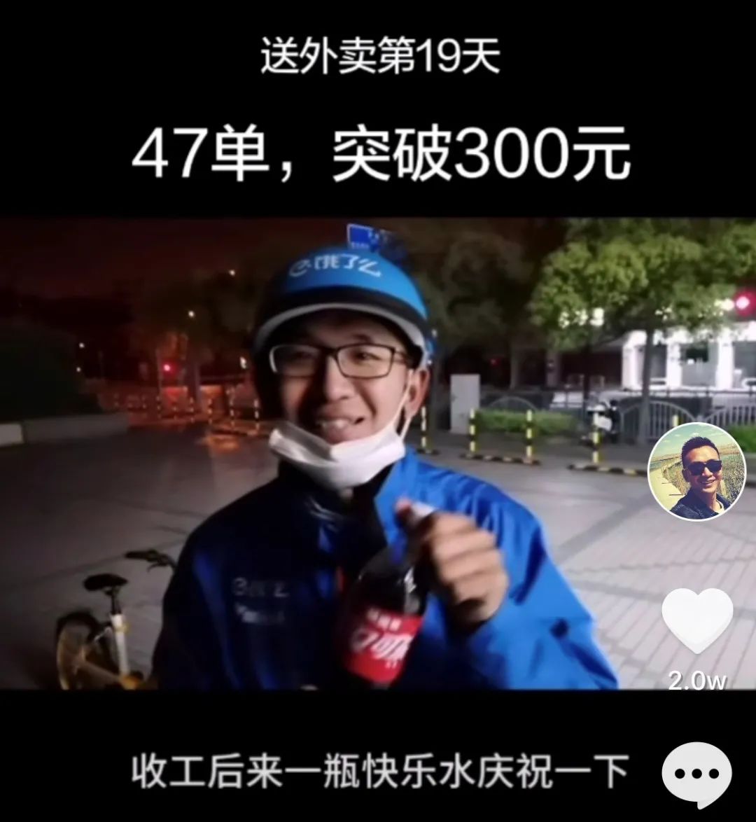 大概一个月前,有一个女孩在短视频APP里跟我联系上,我们互相加了微信,她可能对我送外卖比较感兴趣。我们还没有线下见面,但有很多话题可以聊。总之,跨出送外卖这一步,包括在短视频APP做直播,给我的生活带来了很大的安慰。