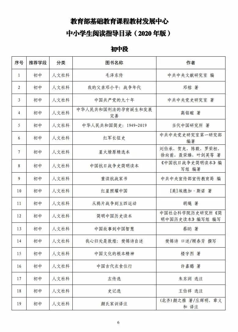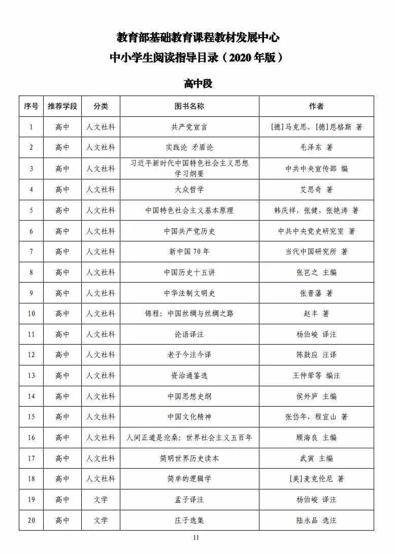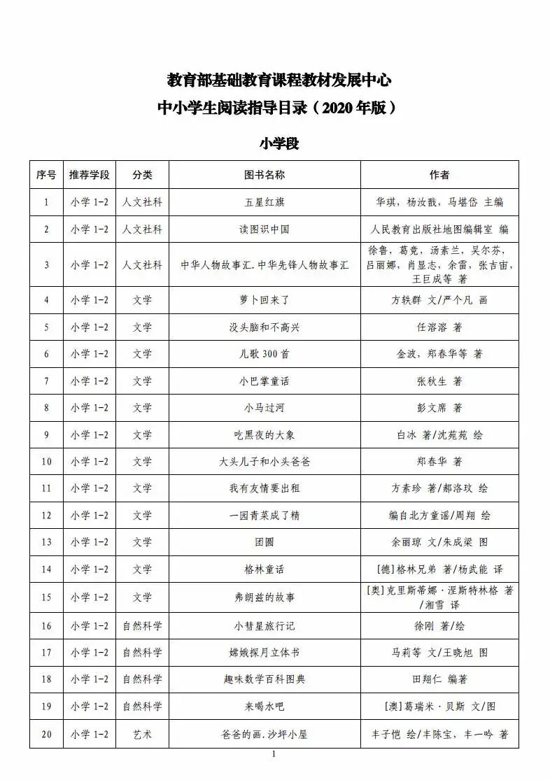 4月22日,受教育部委托,教育部基础教育课程教材发展中心组织研制并发布了《教育部基础教育课程教材发展中心中小学生阅读指导目录(2020年版)》。