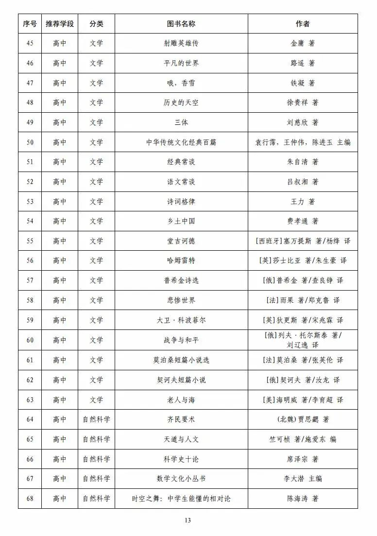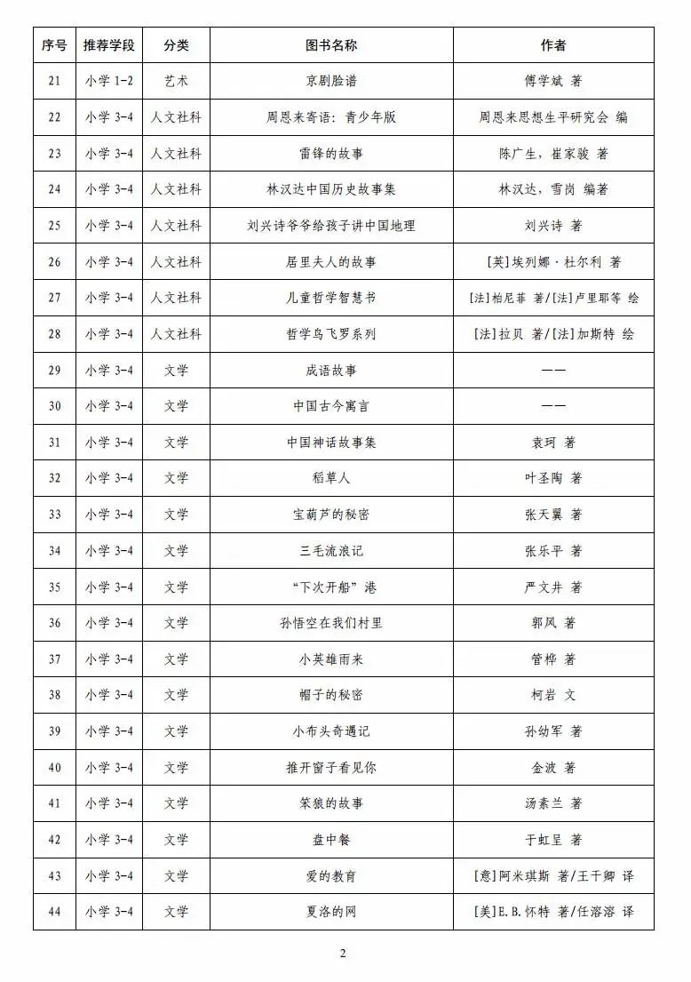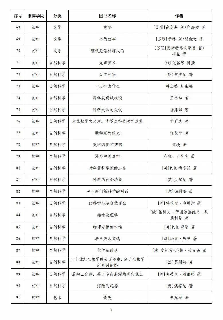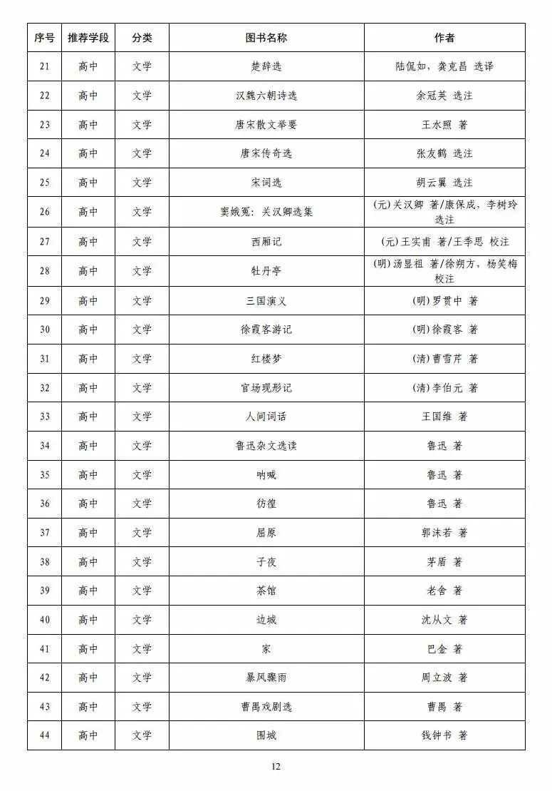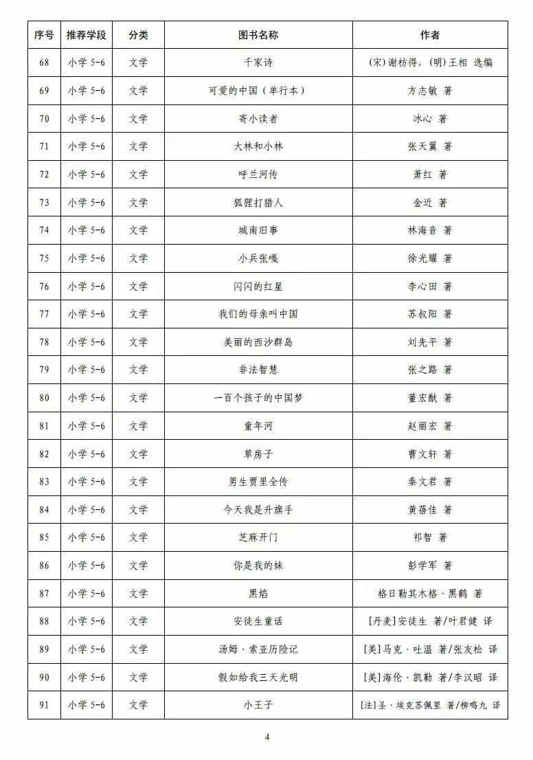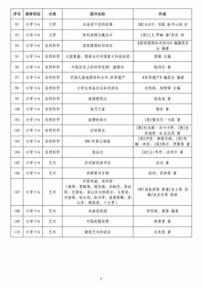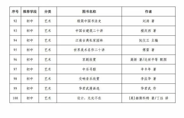 指导目录分为小学、初中、高中三个学段,其中小学110种、初中100种、高中90种,统筹考虑了中小学生阅读时间、阅读特点和阅读数量,供学生自主选择阅读。