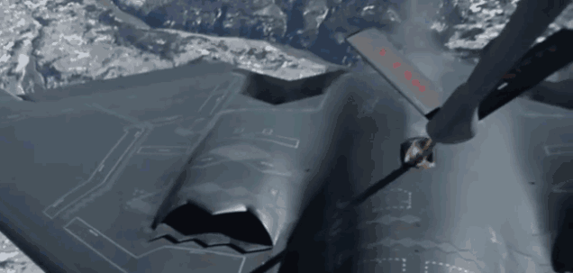 这是B-2轰炸机的纯黑科技,美国B-2隐身轰炸机的翻转加油口。为了高度隐身,B-2轰炸机硬杆式加油口盖有着复杂的隐身设计,能够翻转闭合。在动图中,可以看到B-2隐身轰炸机在脱离加油机时,机翼后缘内侧的升降副翼一直在上下摆动做姿态调整,同时机背的受油插座也在缓缓翻转180度闭合。