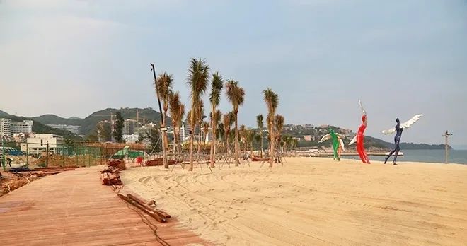 第二阶段为重建工程,目前,约8万平方米的沙滩区域已完成海底杂物的打捞,正开展沙滩的平整、筛选;园林绿化部分正开展绿化种植、石材地面和实木地面的铺装;照明系统、监控系统、预约系统等配套设施正在安装调试;目前正在开展包括卫生间、淋浴间、客服中心、急救中心、停车场、愿望塔风信廊桥、景观廊桥等11个建筑主体的施工。今年“五一”期间,3号卫生间、急救中心、公园入口广场、海天剧场等建筑和设施将投入使用。目前,公园内的地板铺设、景观提升等各项工程还在紧锣密鼓进行中,整体改造的雏形已经基本显露。