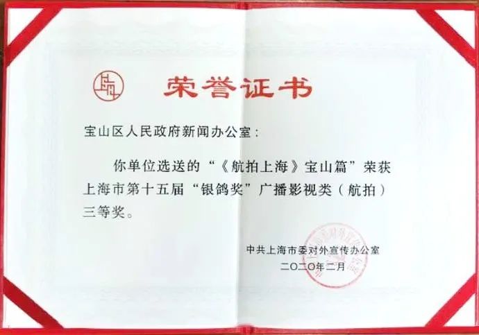 由宝山区人民政府新闻办公室选送的“《航拍上海》宝山篇”荣获上海市第十五届“银鸽奖”广播影视类(航拍)三等奖。宝山究竟有多美?三分钟航拍视角带你领略~