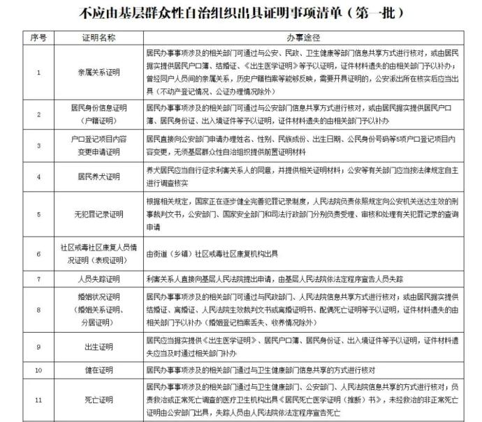 根据中共中央、国务院关于减证便民、优化服务的部署要求,凡是没有法律法规依据或未经国务院批准列入保留证明事项清单的证明事项,基层群众性自治组织不予出具。对虽有法律法规依据但已经不符合当前经济社会发展实际的或基层群众性自治组织没有能力核实的,有关部门要在广泛征求意见、充分调研论证的基础上按程序提请修改法律法规规定,明确基层群众性自治组织不再出具。根据国家有关法律法规规定,适时分批明确不应由基层群众性自治组织出具证明的事项。现明确《不应由基层群众性自治组织出具证明事项清单(第一批)》(见附件)。