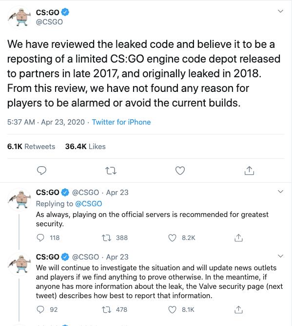 不久之后,CS:GO官方在自己的官方Twitter上表示已经审查了泄露的代码,认为这是一个2017年末发布给合作伙伴的有限的CS:GO引擎代码库,最早在2018年被泄露。但在官方对代码审查之后,官方认为并没有发现任何让玩家警惕或者避免目前版本的原因,因此玩家对此不需要太过紧张。