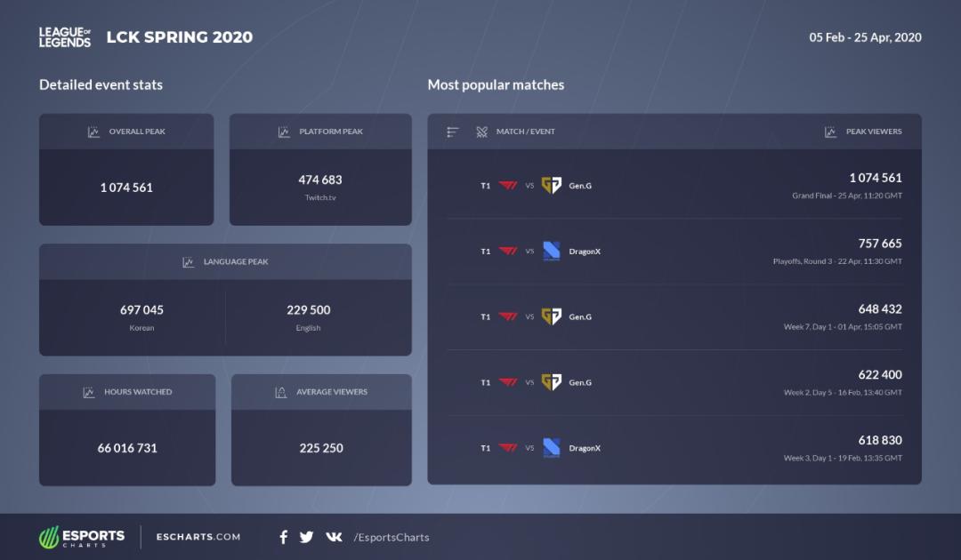 据Esports Charts统计,2020 LCK春季赛决赛T1对阵Gen.G的比赛在国外直播平台上最高同时观看人数达到1074561,创下新的LCK联赛收视纪录。