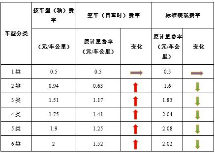 高速公路货运车辆空车通行费用上涨,标准装载行驶通行费用下降。这里所说的标准装载是指该车型的车辆在合法装载范围内,达到最大允许车货总重时。