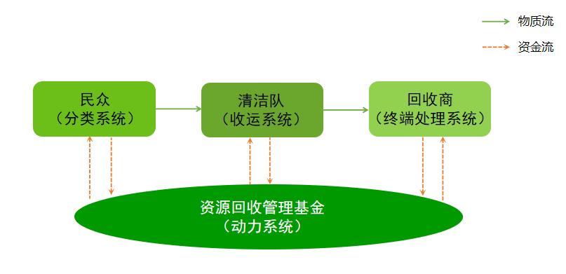 1997年台湾地区推动“资源回收四合一计划”,要求社区组建资源回收互助组织推动家庭垃圾分类、回收和预处理,形成分类系统;官方形成收运系统;回收商负责资源回收,形成终端处理系统;信托基金向回收体系注入资金推动社区、回收商和地方政府清洁队严格执行资源回收制度(如下图所示),进一步明晰了垃圾分类回收的主体责任与运作框架。