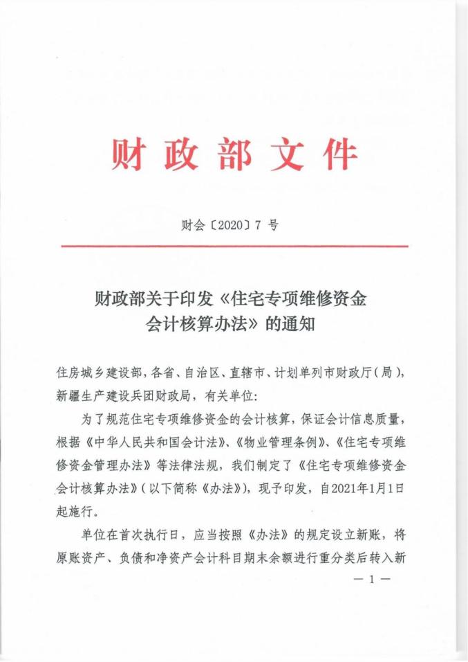 为了进一步规范住宅专项维修资金(以下简称维修资金)的会计核算,保证会计信息质量,促进维修资金的规范管理和安全有效使用,近日,财政部制定发布了《住宅专项维修资金会计核算办法》(以下简称《核算办法》,详情见下方附件)。