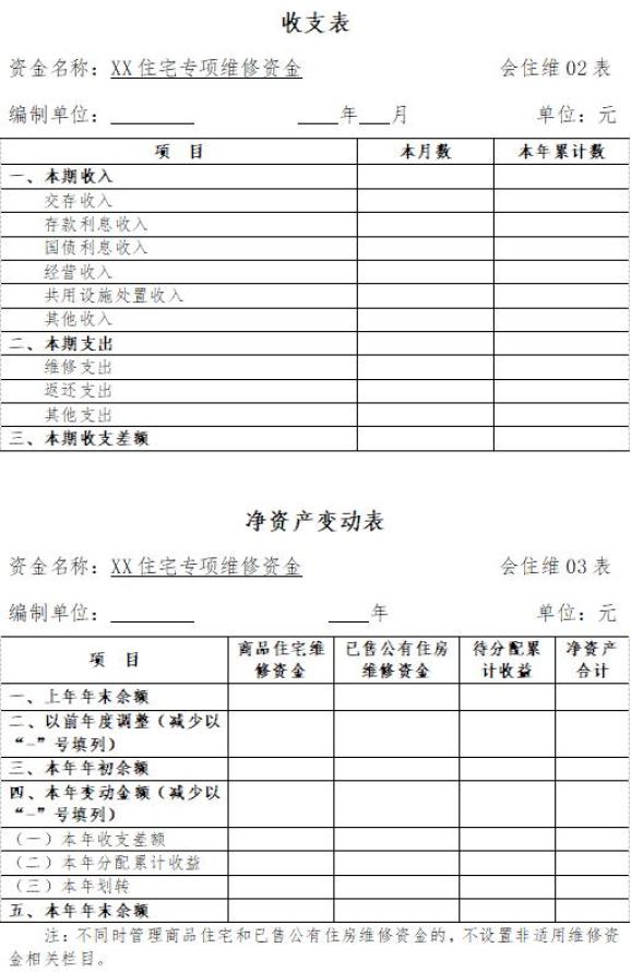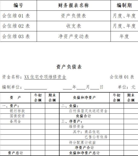 (二)住宅专项维修资金财务报表包括资产负债表、收支表、净资产变动表及附注。