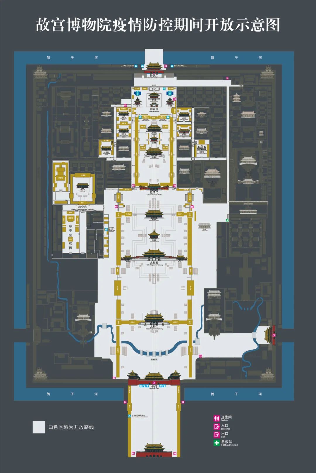 结合当前常态化疫情防控工作要求和我院实际情况,目前开放前三殿、后三宫、御花园、外西路、寿康宫、慈宁花园区域的室外展区及东西六宫部分院落。珍宝馆、钟表馆等室内展厅和室内服务场所暂不开放。午门城楼、东华门城楼、神武门城楼及相连城墙暂不开放(见故宫博物院疫情防控期间开放示意图)。开放的原状陈列殿宇采取殿外护栏隔离的参观方式。