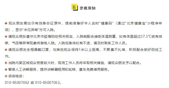 4.限量预约开放期间,观众入馆须配合进行身份证核录、出示本人实时健康码(也可通过北京健康宝小程序提前申领当日健康码)、接受健康监测,未见异常后方可入馆。