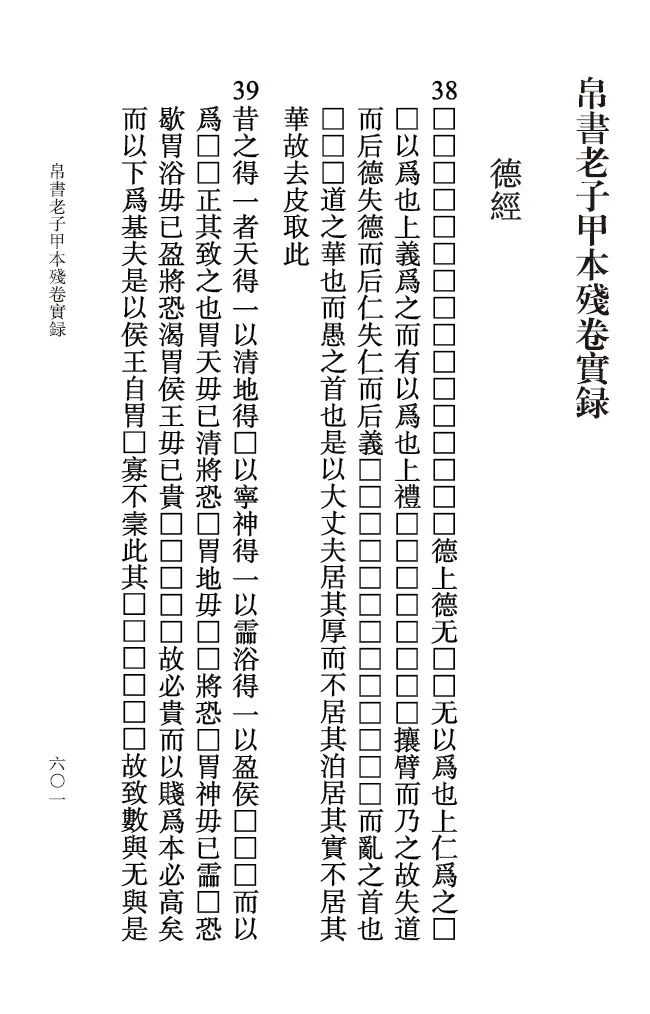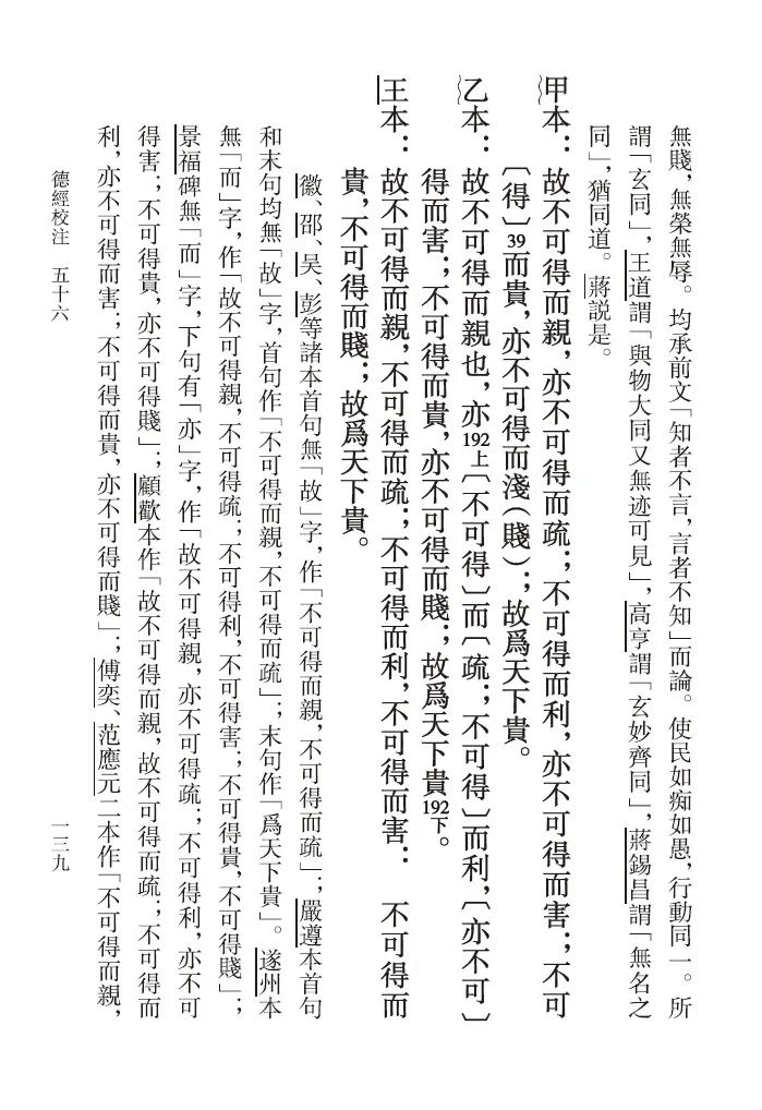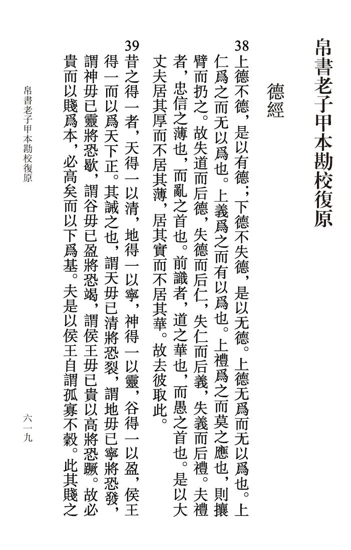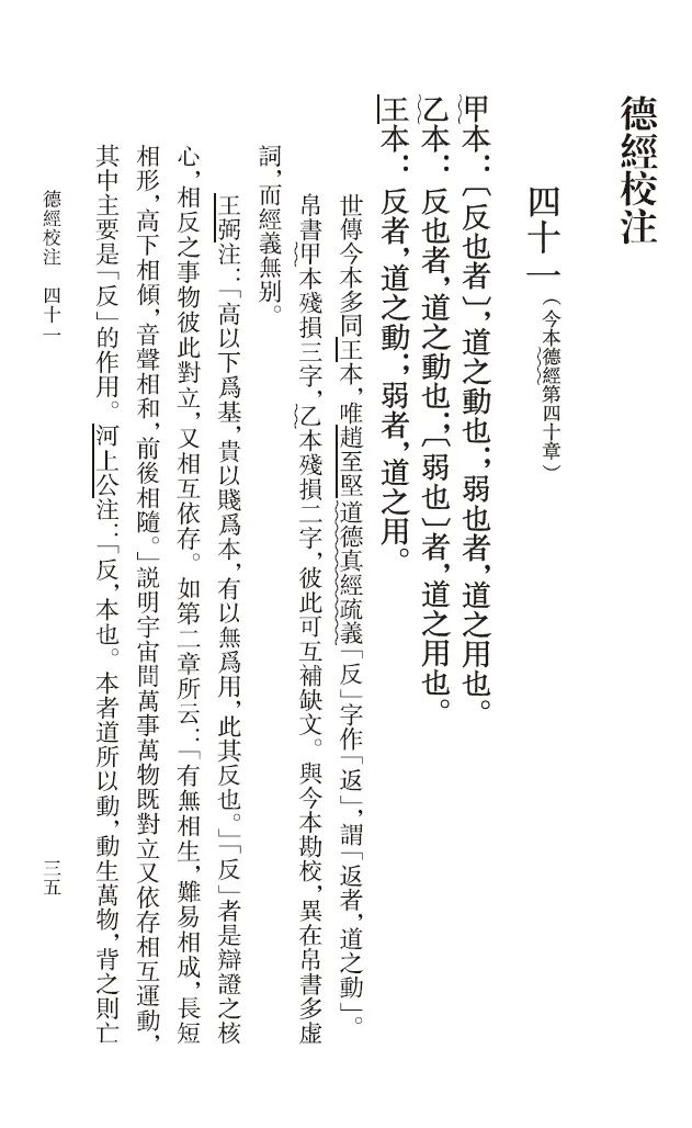 二、条目清晰,异文一目了然。帛书《老子》甲、乙本皆不分章,也就是没有所谓的“八十一章”,为便于与今本对照查阅,此书依帛书《老子》篇次,《德经》在前,《道经》在后,参照今本章次,依次按照帛书甲、帛书乙、王本的顺序分句段抄录,每段经文之前皆用汉语数字标明序号,以便有条理地勘较。因今本原有错简,凡遇今本章次倒误而与帛书甲、乙本经文序次不合者,均在序号下加注说明。