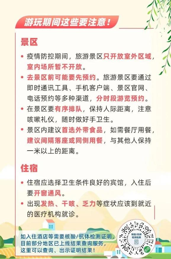 来自聚集性疫情发生地区的游客,除持有“健康通行码”绿码外,还需提供近7天的本人核酸阴性检测报告及本人身份证方可入园。