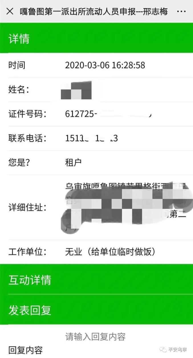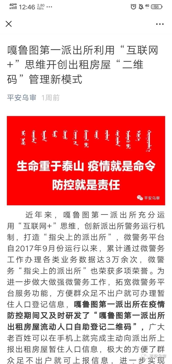 为进一步做大做强微警务工作,拓宽微警务平台服务功能,方便群众足不出户就可办理暂住人口登记信息,嘎鲁图第一派出所紧扣新时代“枫桥经验”,在疫情防控期间又及时研发了“嘎鲁图第一派出所出租房屋流动人口自助登记二维码”,广大老百姓可以在手机上就完成主动向派出所上报出租房屋暂住人口信息,极大的方便了群众足不出户就可上报信息,进一步实现了“让数据多跑路、群众少跑腿”的工作目标,同时,该二维码的投入使用,也为广大社区民辅警减轻了工作负担,还可以及时掌握辖区出租房屋暂住人口信息。 “放心扫”,自助式登记信息高效便捷。在保障信息安全的前提下,充分借助互联网不受时间空间限制的特点,建立互联网与便民利民服务新平台。公众扫描“二维码”可自主进行登记出租房屋信息及租客信息。一是足不出户方便快捷。为方便群众实现网上自助登记备案,及时研发了“嘎鲁图第一派出所出租房屋流动人口自助登记二维码”,20名社区民辅警每人一个二维码,社区民辅警在宣传法律内容的同时,将自己的二维码同时附上转发,广大群众足不出户,在家就可通过社区民辅警提供的“二维码”,实现自助登记自己的出租房屋信息及租客信息。截止目前,辖区老百姓主动向我所登记上报出租房屋流动人口信息3373人,其中,通过“二维码”平台登记上报883人,通过电话、短信、微信上报2255人,主动到派出所上报235人。二是面对面扫码登记。房主在进行房屋出租时,房主和承租人只需要扫一扫社区民辅警所属的“二维码”就可完成房主个人和承租人信息自助登记上报。社区民辅警可以第一时间收到信息,并将信息录入平台核验身份,进一步挤压违法犯罪分子的藏匿空间,降压可防性案件的发生,提升居民安全感。 “快捷融”,开放式数据应用减负增效。“二维码”数据应用深度服务“最多跑一次”改革、基层治理现代化,助力社会治理减负增效。一是实现“码上登记”零跑腿。广大群众可以通过“二维码”登记信息,也可以通过“指尖上的派出所”同步实现居住证办理、从业人员申报登记,散装汽油购买登记,消防监督管理上报,实现“码上办证”、“码上登记”。二是实现基层治理减负增效。指尖上的“二维码”让基层民辅警从信息的采集者真正变成信息的管理者。在流动人员登记管理中,房屋租赁时只要扫一扫“二维码”,即可在线申报承租人信息并核实身份,辖区民辅警通过手机后台实时掌握外来人口信息,可实时发现未登记的流动人员,有效提升了服务的精准性。针对散装汽油等重要领域,扫扫“二维码”即可实时发现有异常情况的加油人信息,弥补了安全管理漏洞。 “零接触”,远程式监管轻松精准。在广大群众、房主或者承租人轻松扫码登记、核验身份、办证办事的同时,实现公民信息非接触采集、人员动向动态化留痕的智能化管理。一是实时远程监管。针对承租人员不稳定、流动性强、行业监管难的问题,嘎鲁图第一派出所坚持以信息化为支撑,实行网上网下、服务管理同步走,加大对流动人口、出租房屋管理有关法律法规的宣传力度,让房主、承租人知晓申报义务和所应承担的法律责任;积极开创出租房屋管理“二维码”模式,确保流动人口、出租房屋信息准确、鲜活,实现辖区流动人口管理服务工作精准化、精细化。二是即时性预警预防。“二维码”在提供身份实时核验的同时,还联通公安信息化实战平台进行大数据碰撞比对,公安机关在保障个人隐私的前提下,根据碰撞产生的不同情况采取不同类型的管控措施。原标题:《这个派出所开创出租房屋“二维码”管理模式》