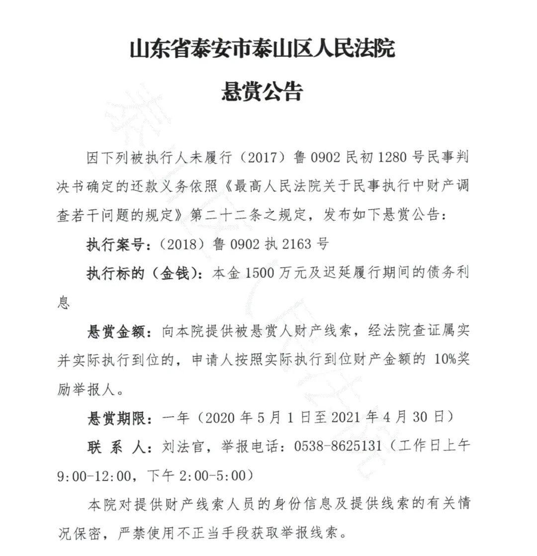 原标题:《山东省泰安市泰山区人民法院悬赏公告》