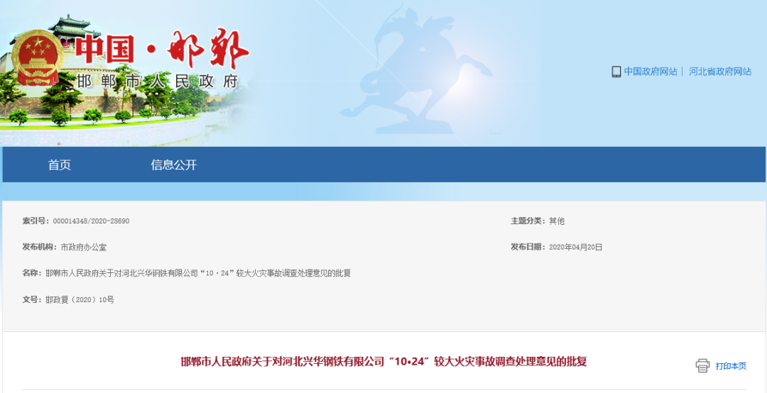 你局《关于河北兴华钢铁有限公司“10·24”较大火灾事故调查处理意见的请示》(邯应急呈〔2020〕14号)收悉。经研究,现批复如下: