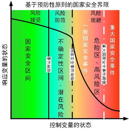 国家安全学是研究国家安全的组成、结构、功能、动态发展及其应对机制的应用型学科,从多空间尺度、多动态时相、多要素、多过程角度出发,用系统的、综合的、区域联系与历史联系的观点与方法研究影响国家安全的要素,核心在于研究国家安全界限和发展的途径,规避不利因素,应对不利影响,从而对总体国家安全进行评估、预测、规划、管理、优化与调控。基于预防性原则,国家安全界限主要包括国家安全区间、不确定区间和危险区间(图1)。三个区间之间存在阈值,并通过渐发-突变-累积的方式发生量变到质变的转换。国家安全区间内的风险可以采取接收或降低的方式,不确定性区间由于人类认知的限制,需要采取风险防范;而危险区则由于高风险的存在需要以风险规避的方式采取综合风险防范。国家安全及其界限是以国家为主体,通过国家安全的总体环境、国家安全的结构功能和国家安全的总体关系三个子系统的相互作用,发生了系统的不平衡,最终导致国家安全事件发生(图2)。国家安全学正是研究对国家主体及其总体环境、结构功能和总体关系的科学。