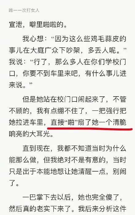 @小雨新荷:我绝对不相信这是他唯一一次打女人。他是一个很传统的中国男人,骨子里刻着对女性的偏见和歧视。