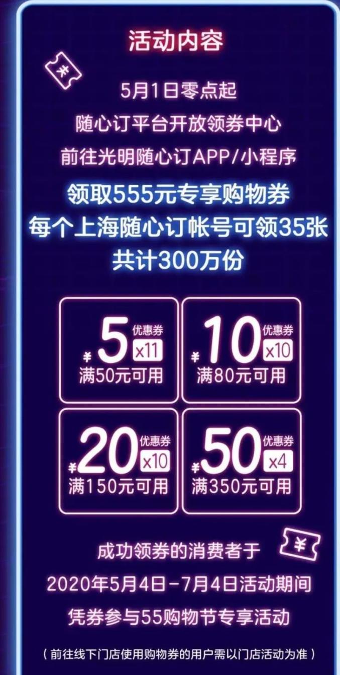 2020年5月1日至7月4日,光明食品集团旗下线上平台以及农工商超市、第一食品、好德、可的、良友便利、光明悠焙等3000多家线下门店线上领券,线上线下同步用券。