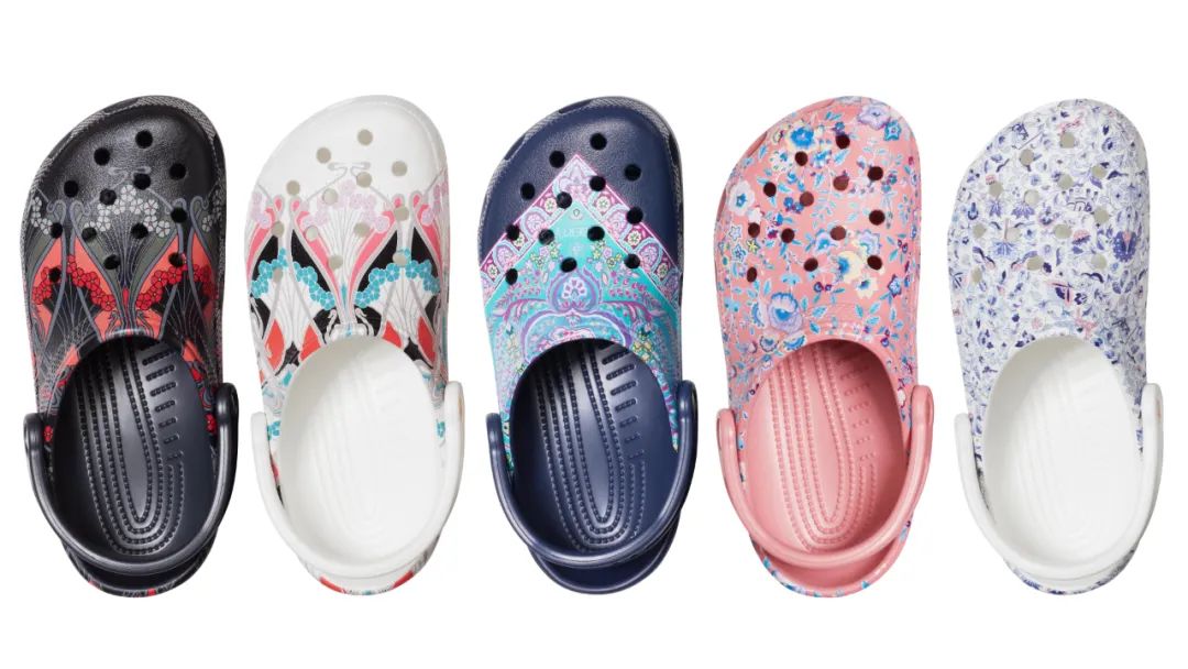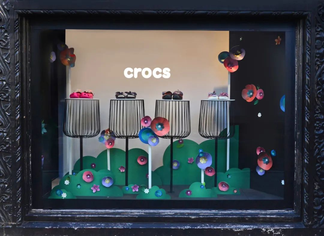合作期间,Liberty London的店铺橱窗也展示了Liberty London & Crocs独家定制款丝巾的限定款Crocs 经典克骆格及凉拖,魔法般的仙境场景,传递合作系列的趣味印花设计和花卉灵感。