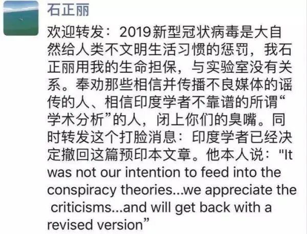 2月2日,针对印度学者质疑新冠病毒源于实验室的论文,她在自己个人微信朋友圈发文:“2019年新型冠状病毒是大自然给人类不文明生活习惯的惩罚,我石正丽用我的生命担保,与实验室没有关系。”