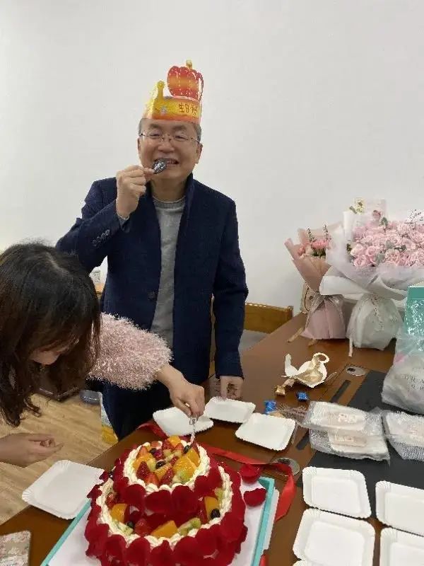 一起吃蛋糕,给老师戴生日帽