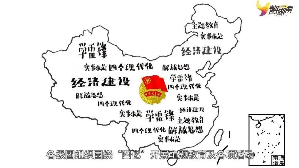 应《中国青年》杂志之邀,毛泽东为学雷锋活动题词:向雷锋同志学习。在探索社会主义道路时期,共青团带领广大团员青年积极投入到经济建设的各项事业中,做社会主义建设的突击队,做战胜艰难险阻的生力军。1978年12月,党的十一届三中全会,提出以“四化”为中心,再次确立要解放思想,并做出重大决策——把工作重点转移到经济建设上来。随后,团中央也向全国青年发出号召,各级团组织围绕“四化”开展主题教育及各项活动。 1991年成立了“中国青少年研究中心”,推进全团理论研究工作的深入发展。根据形势和社会发展的要求,共青团还加强了代表和维护青少年权益的工作,推动出台《中华人民共和国未成年人保护法》。改革开放扩大了共青团的工作领域,1989年组建了中国青少年发展基金会,发起“希望工程”,邓小平亲自为“希望工程”题词。1988年团的十二大确定《光荣啊,中国共青团》为中国共青团代团歌。至此,团徽、团歌、团旗都成为了共青团正式的象征符号。1992年春,邓小平南巡发表一系列讲话。他先后到武汉、深圳、珠海、上海等地视察,讲话针对人们思想中普遍存在的疑虑,重申了深化改革、加速发展的必要性和重要性。