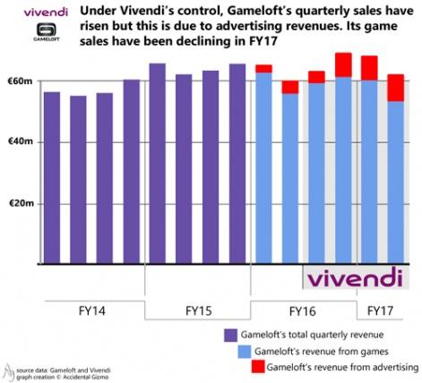 在收购之后,维旺迪向全体员工发了一封信:说希望这是一次伟大的全新旅程。事与愿违的是,在维旺迪收购 Gameloft 以后,更改了游戏制作的策略,开始在游戏里添加氪金项目,甚至宣称不再制作收费游戏,只提供鼓励氪金的F2P游戏(注:Free to play,免费游戏。)面对 Gameloft 的境遇,很多玩家纷纷谴责开始声讨无良公司维旺迪,认为它是让 Gameloft 失去活力的元凶。如今的《狂野飙车》,也成了一款充满氪金内购的免费游戏▼
