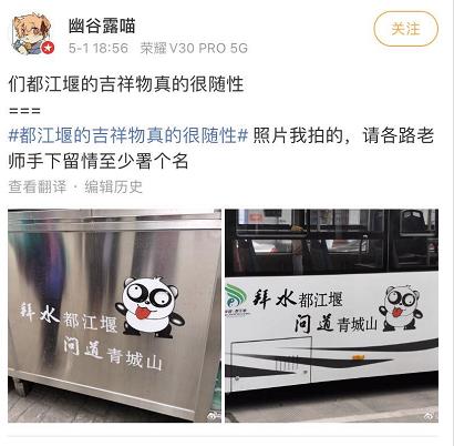 5月1日,网友@幽谷露喵 发了一条微博,表示“都江堰的吉祥物真的很随性”,并配上了自己拍摄的照片。