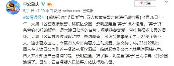 5月1日,警方通报偷捕重庆大渡口公园网红鲤鱼“莽子”的4名嫌疑人已被依法行政拘留。四人交待,他们于4月23日在公园附近饮酒后,临时起意到公园池塘用渔网捕鱼,四人并不知道自己捕捞的是一条明星鱼。