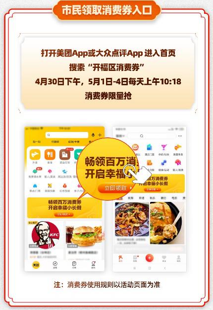 点击首页正中间的领券页面,或在首页搜索“开福消费券”,即有机会领取价值200元的消费券包,领取后自动计入该手机用户的美团账号。
