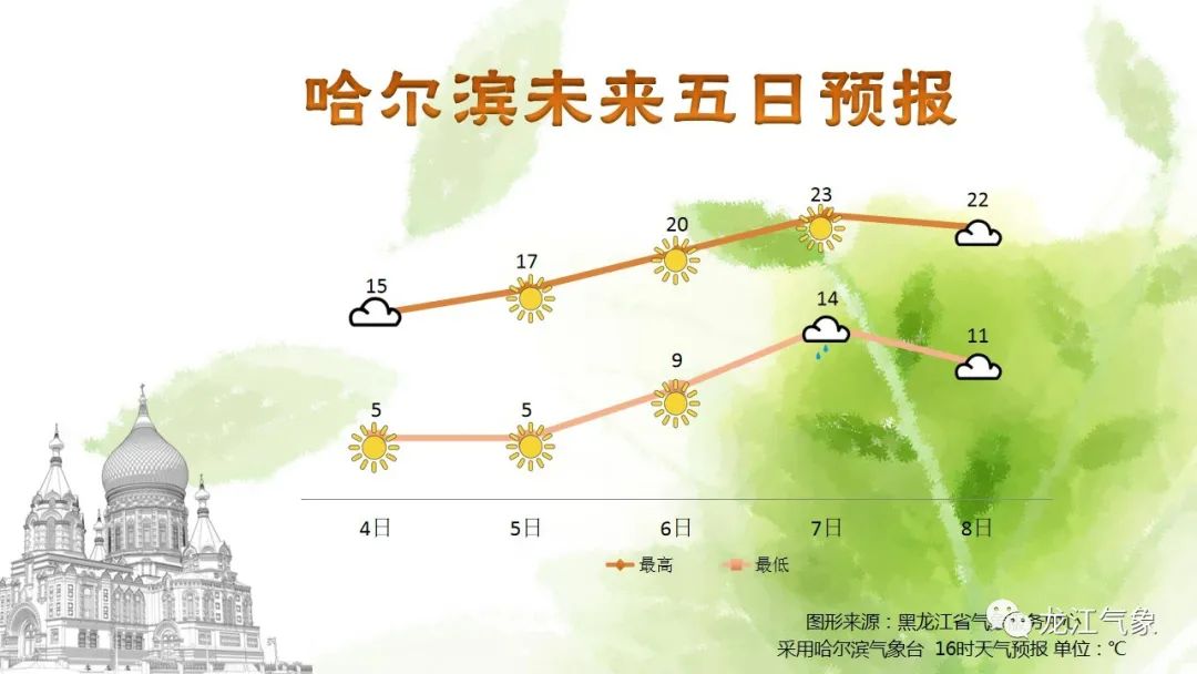 4日白天最高气温:齐齐哈尔、大庆16~18℃,其它地区13~15℃。
