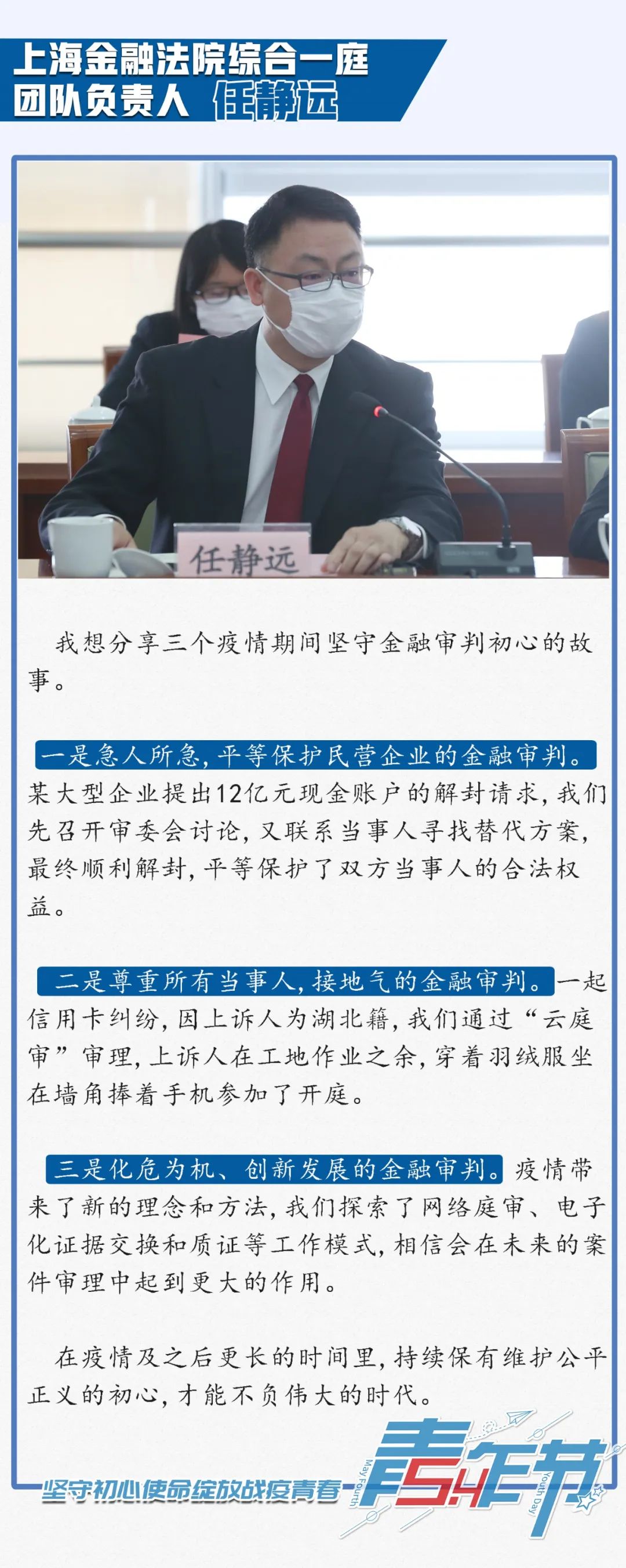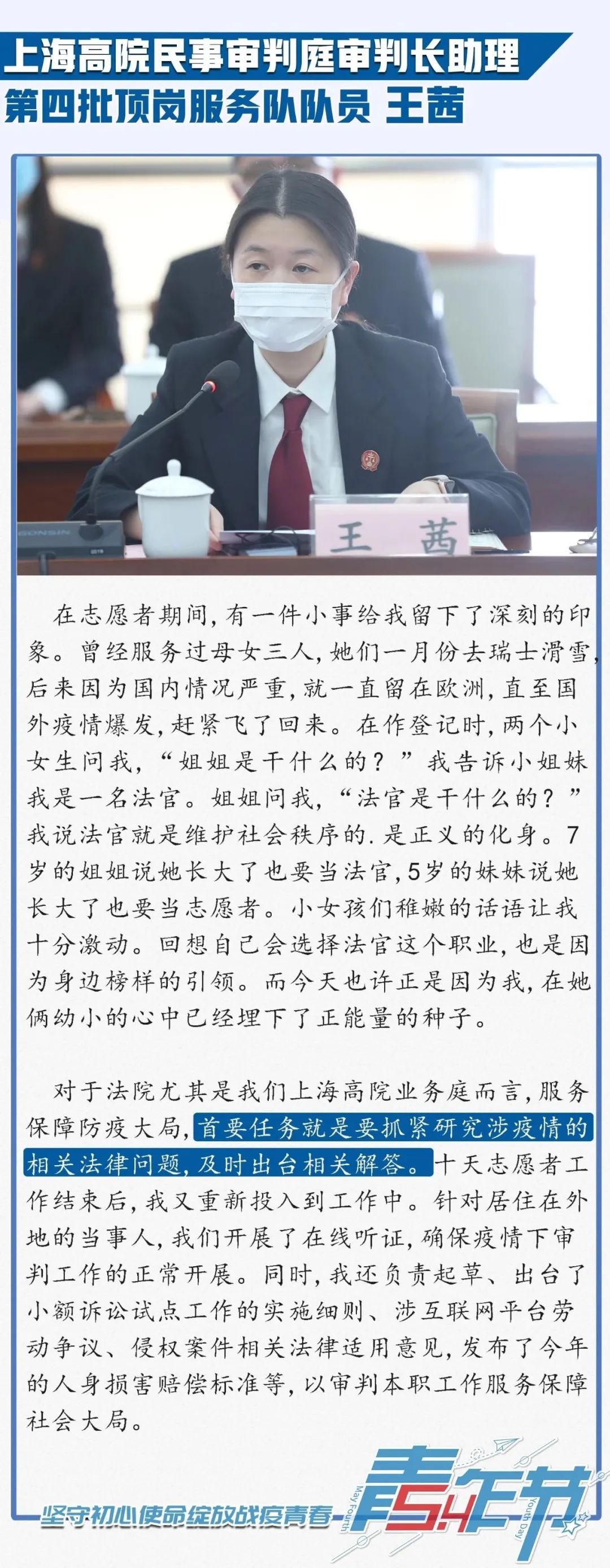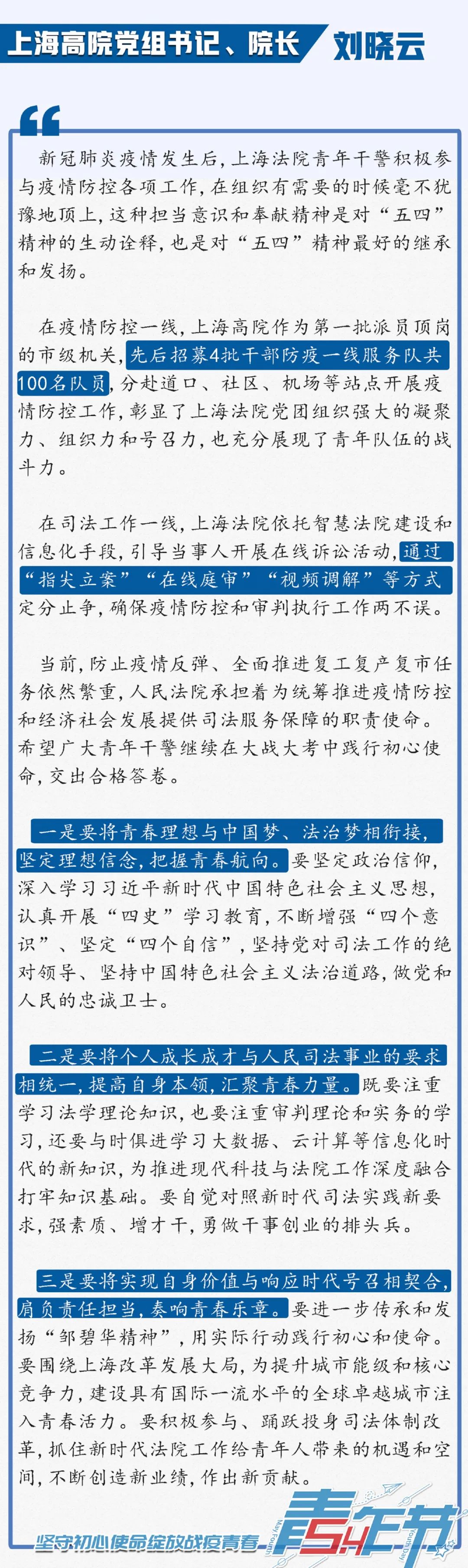 今年是“五四”运动101周年,为弘扬和传承“五四”精神、激励上海法院青年践行司法为民初心使命,日前,上海市高级人民法院(以下简称上海高院)组织召开“迎‘五四’,坚守初心使命绽放战疫青春”青年座谈会。上海高院党组书记、院长刘晓云出席座谈会并讲话,上海高院党组成员、副院长茆荣华主持了座谈会。在疫情期间奔赴抗疫一线及坚守审判执行工作一线的12名法院青年代表参加座谈会,并结合疫情防控和审判执行工作作了发言。