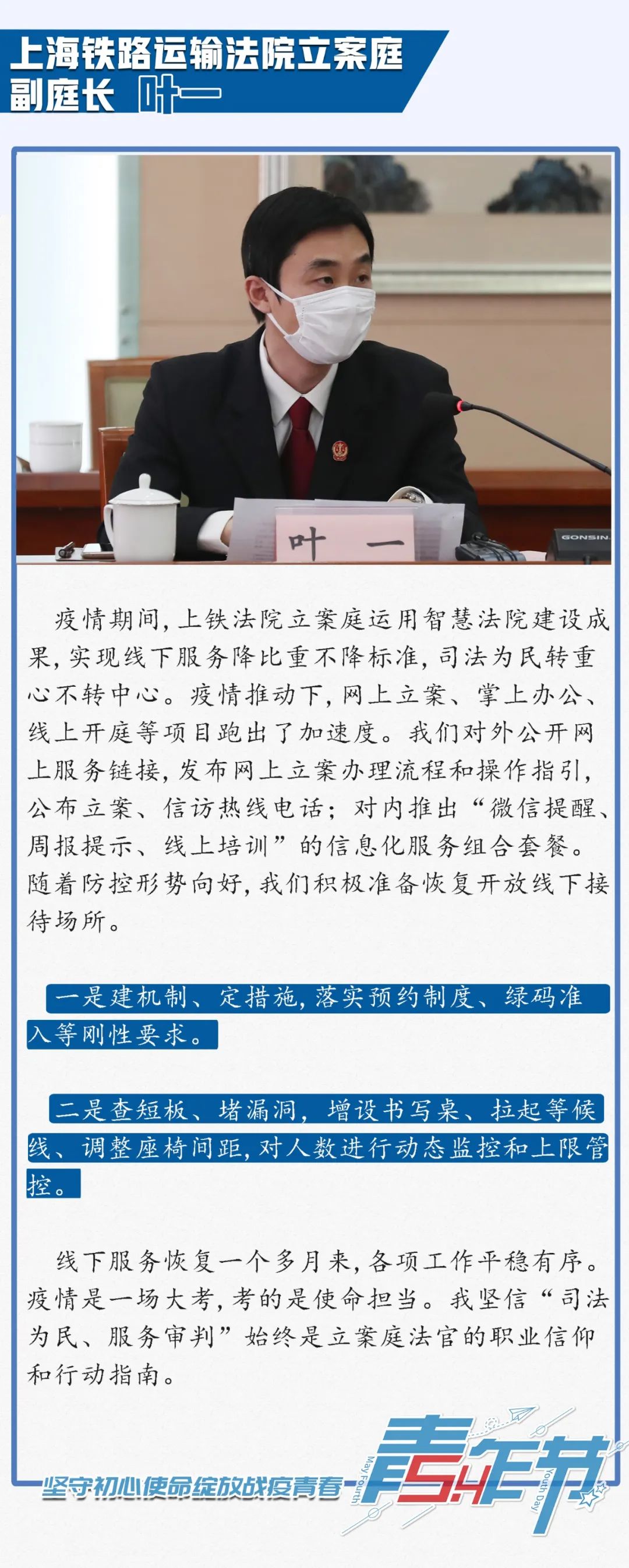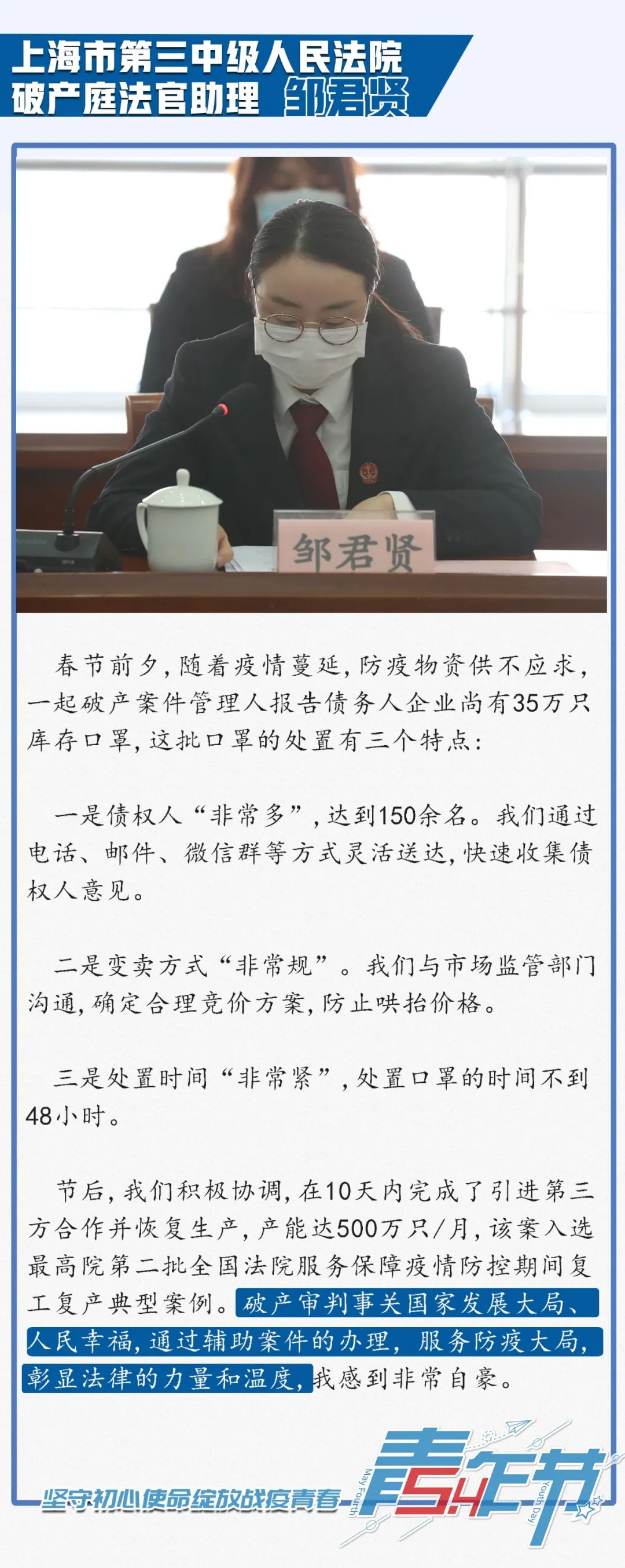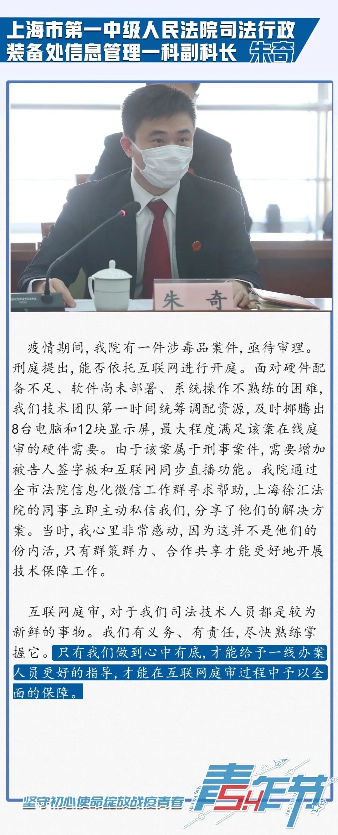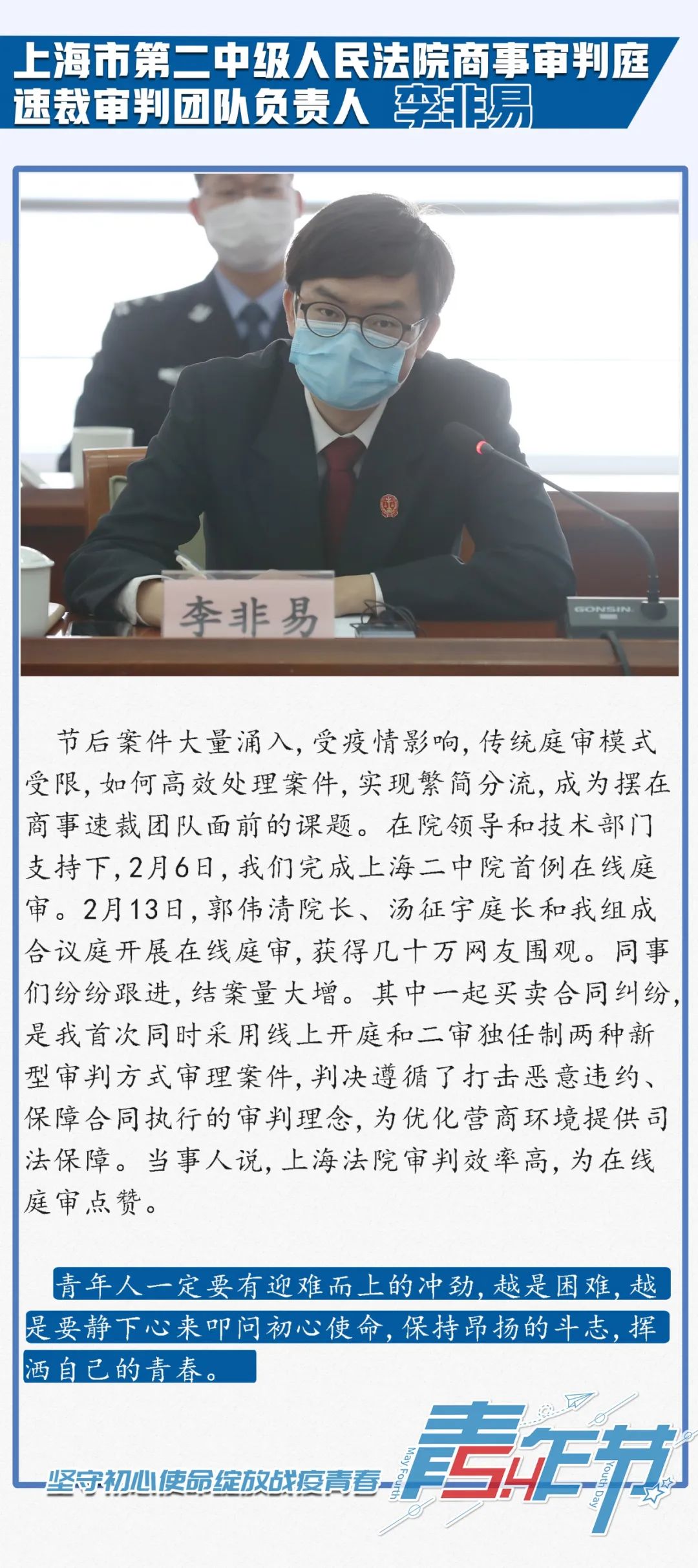 今年是“五四”运动101周年,为弘扬和传承“五四”精神、激励上海法院青年践行司法为民初心使命,日前,上海市高级人民法院(以下简称上海高院)组织召开“迎‘五四’,坚守初心使命绽放战疫青春”青年座谈会。上海高院党组书记、院长刘晓云出席座谈会并讲话,上海高院党组成员、副院长茆荣华主持了座谈会。在疫情期间奔赴抗疫一线及坚守审判执行工作一线的12名法院青年代表参加座谈会,并结合疫情防控和审判执行工作作了发言。