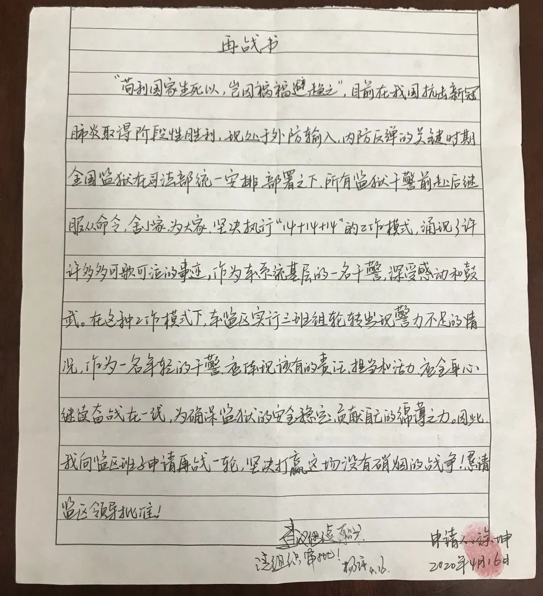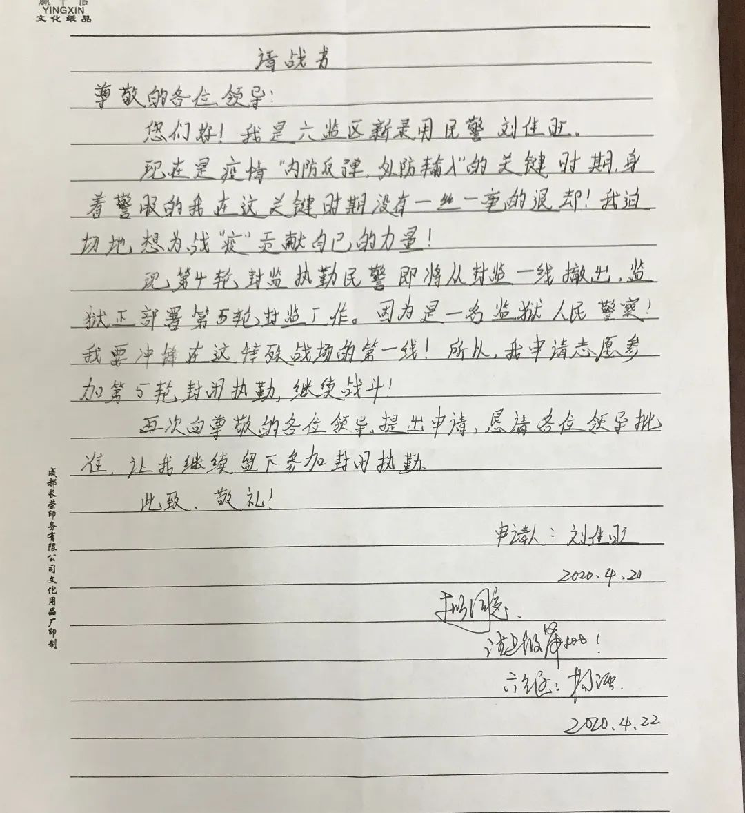 二监区民警 陈奕佑 25岁从警第一年,面对突如其来的“新冠疫情”,隔离备勤,让我有机会进一步自我完善;封闭执勤,让我在平凡的岗位上践行担当。党旗、AB门、警服、汗水,赋予了这个“五四”新的内涵。我坚信,此刻还有千千万万的九零后、零零后同我一样坚守岗位,用这种特殊的方式来珍藏这个“青年节”。我们年轻一代的世界里,不仅有诗和远方,同样心系家国与边关。