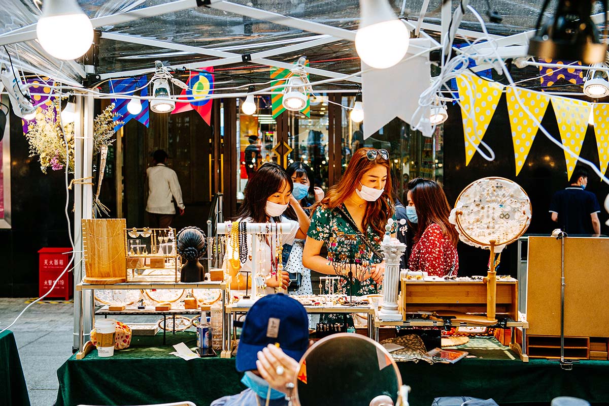 小尖顶,这是南京东路上第一百货商业中心A楼和C楼两幢建筑之间的小马路——六合路上开设出的手工文创类市集,百米小路上60个摊位一字排开,从早上11点一直亮到夜间9点。由于每家商户摆摊于透明材质的尖顶帐篷之下,这个市集就被大家昵称为“小尖顶”。没想到,这个汇集了原创匠人手作的小小市集,一下子成了南京路上的“网红”,5月1日以来,平均一天人流量在6万左右。