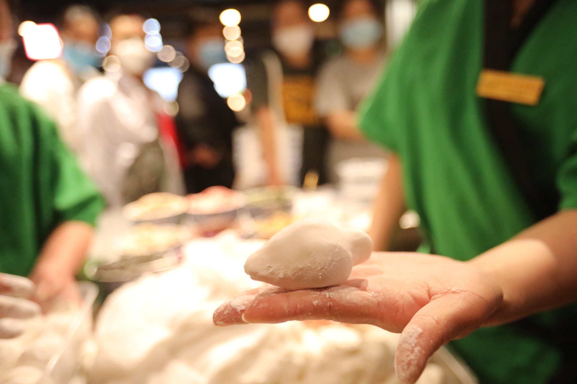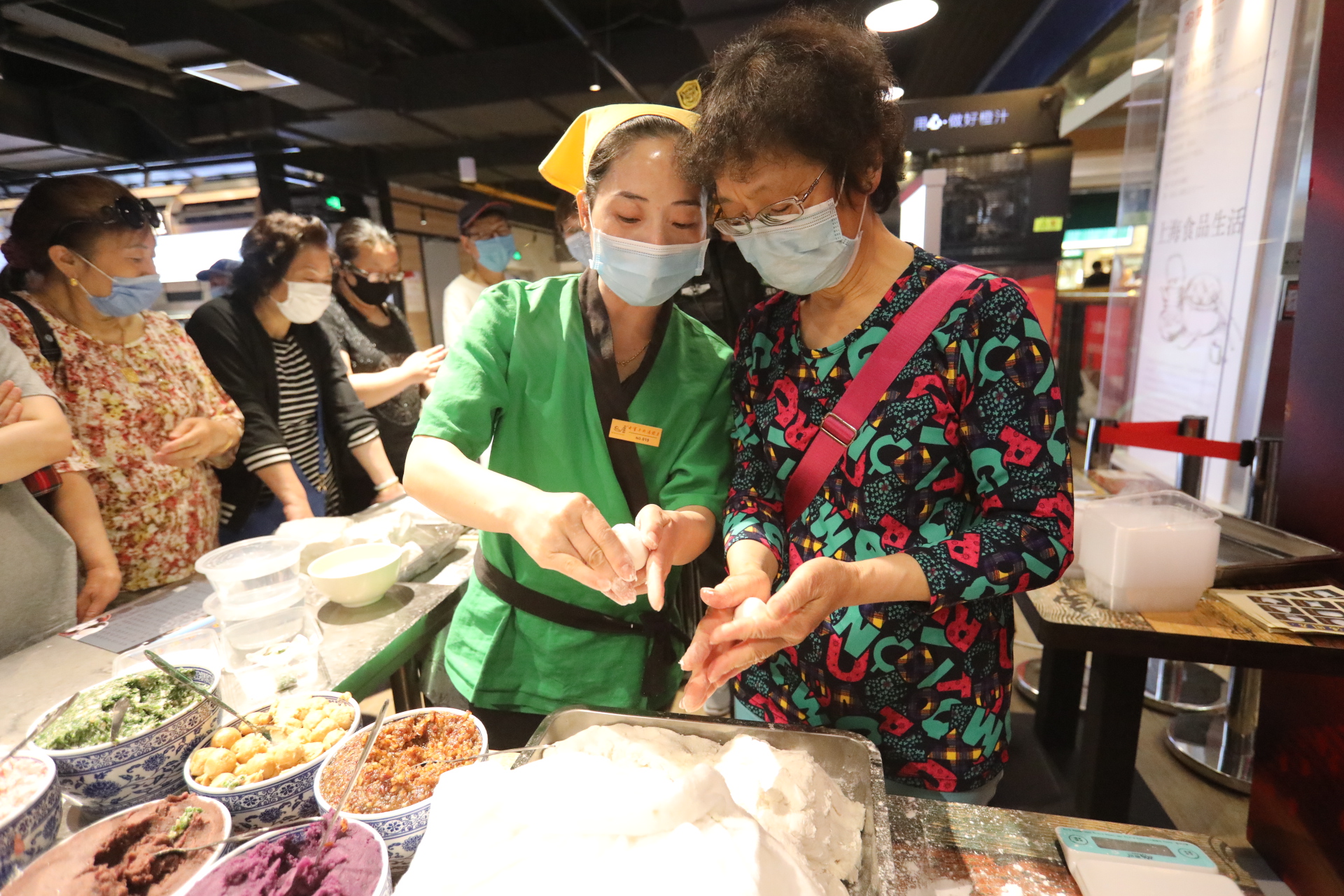 互动体验活动,老字号怎能缺席?从做大壶春生煎到包粽子, “五一”期间,第一食品五角场店每天都安排了一场老字号的互动体验,天天不重样。今天下午,七宝老街汤团成为当仁不让的体验活动主角。三楼的互动现场,一字排开的料理台上放着七八个青花瓷大碗,里面分别装着枣泥、鲜肉等馅料。师傅们为现场观众一一拆解七宝汤团好吃的“秘密”。比如,不同品种的汤团“体重”各有讲究:猪肉馅的咸汤团,每只的分量一般在60克左右,馅料和面皮各25克和35克;而甜口的汤团,还要区分具体的馅料,芝麻馅的汤团每只50-52克、红枣馅的每只最好控制在55克以内,七宝老街汤团第一食品五角场店店长郑长江告诉记者:“这些都是师傅们在实际操作中总结出来的经验,确保吃的时候能一口咬到馅。”
