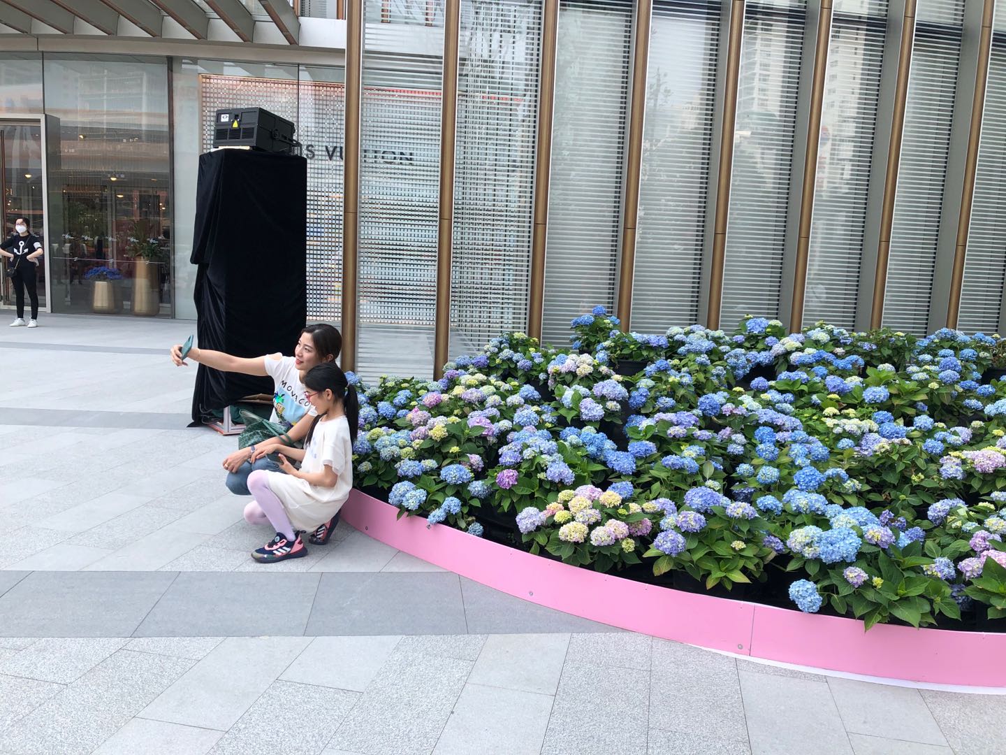 “妈妈,我想和这些粉色的花合张影。”从奉贤开了40分钟车的廖小姐一家,在港汇恒隆广场前的“花海”驻足了很久,廖小姐给自己的女儿拍了许多照片。港汇恒隆广场花坛选用的是象征着“希望、团圆、美满”的绣球花,除了廖小姐一家,许多家长带着小孩子在这里玩耍。