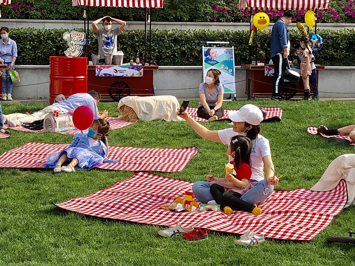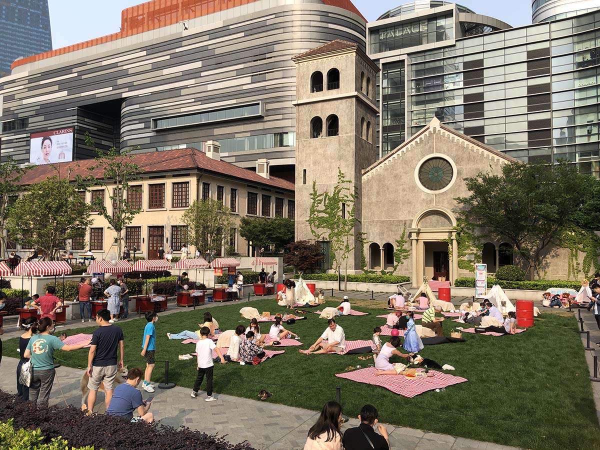 春光明媚,长宁来福士钟楼前的大草坪上,形形色色的游人聚集在那里:有家长带着小不点孩子扔飞盘的,有一大家子铺了桌布享受野餐乐趣的,还有女孩带了宠物,时不时互动的小美好。