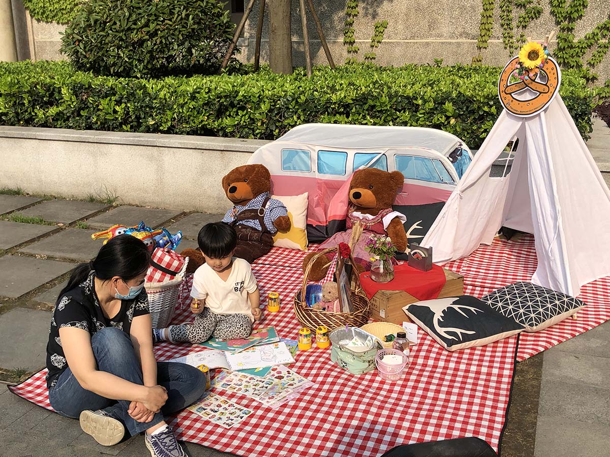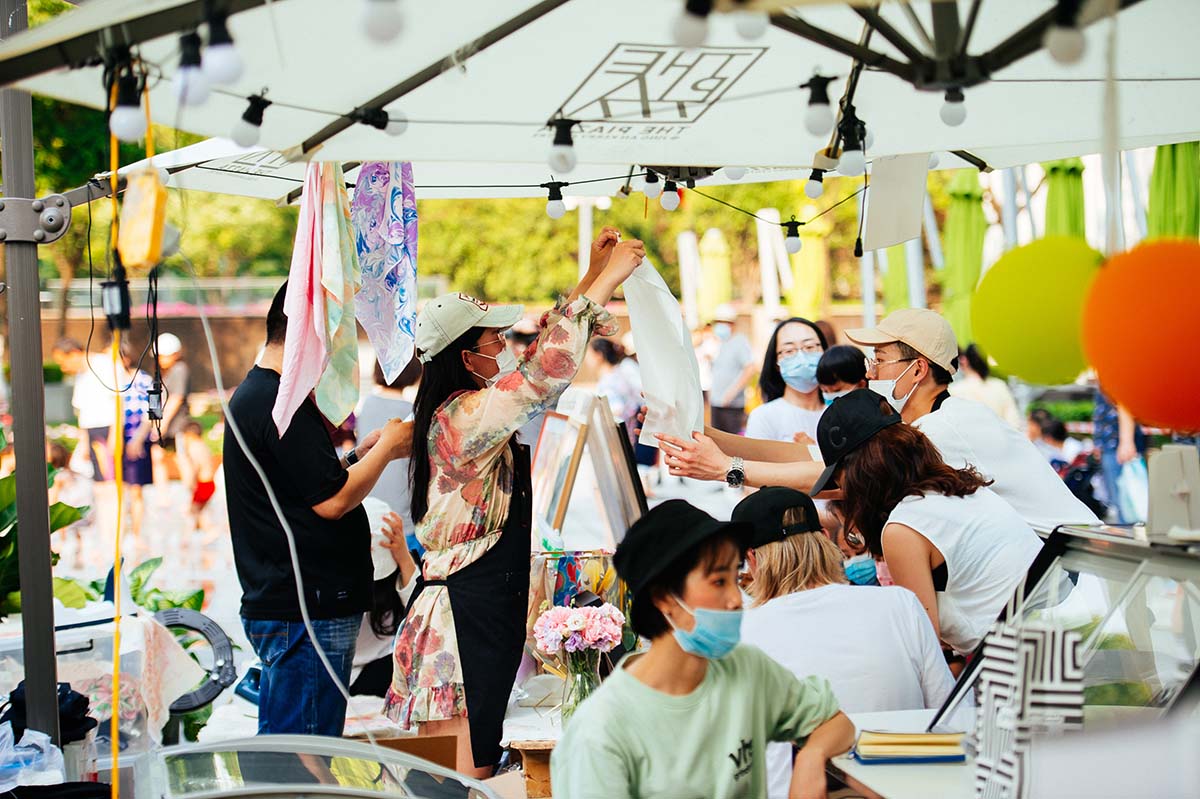 除了食物,草坪边的小画布也让人眼前一亮。这是一个少儿艺术教育的摊位,许多孩子们在趴在画布前涂鸦。“我今天画了我和妈妈,这就是我们在这儿玩的情景。”5岁的悦悦画得不亦乐乎,一旁的妈妈笑着说,他们家就住附近,所以经常来走走看看,这里的绿地很适合亲子嬉戏。