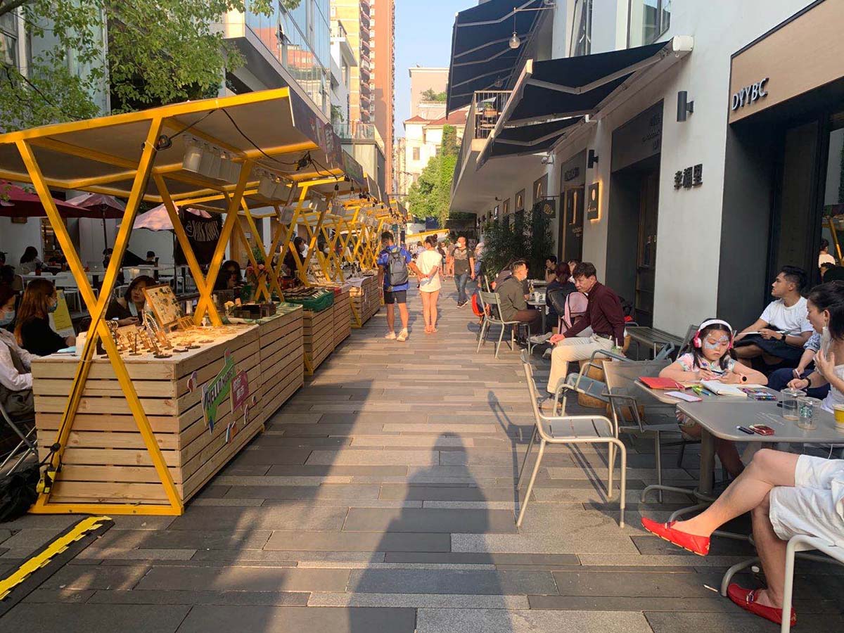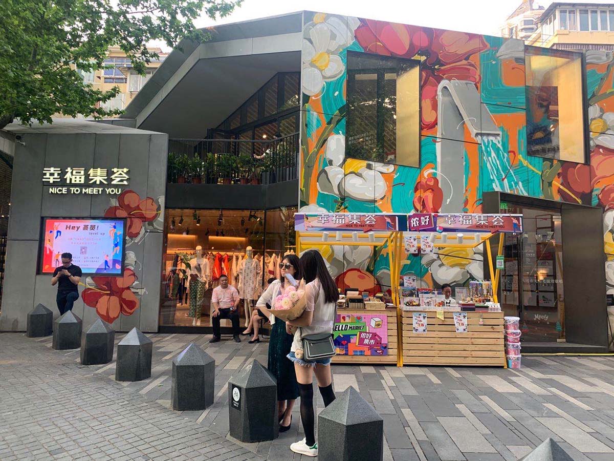 从上海影城出发,沿番禺路向北步行五六分钟,便来到了文艺范十足的幸福里,就和名字一样,这个被打造成“城市会客厅”的街区走出阴霾,逐渐恢复的幸福景象:遛娃遛狗的居民在这里重聚,各家网红店又迎来了打卡的小姐姐,幸福集荟书店里,人们停留的时间越来越长……五一期间,这里举办了一场别具特色的“侬好集市”,手工艺品、美食、文创产品等等,令人目不暇接。