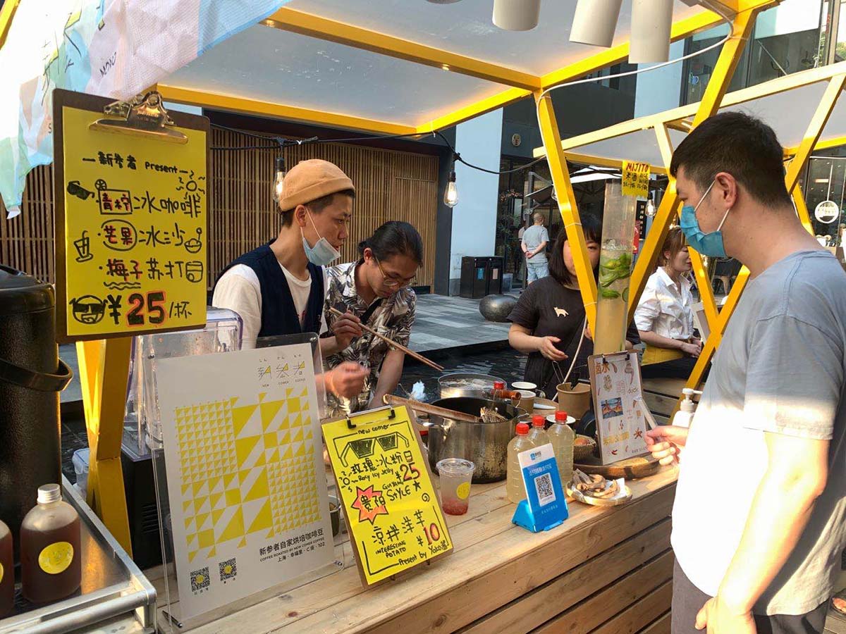 相隔不远,新参者咖啡则是幸福里的资深网红店,这次,来自贵阳的店主和她来自五湖四海的小伙伴们合租了一个美食摊位。“这道凉拌洋芋是贵州的地道做法,配玫瑰冰粉超赞!”另一边,她的广州朋友照看着一口香气四溢的大锅,秘制卤味制成的鸭翅、鸭掌散发着诱人的香气。“我们是正宗广州卤水配方,鸭掌今天卖完咯,明天赶早。”就在记者采访的短短几分钟,他们还卖出了五六杯莫吉托、冷萃咖啡等饮料。